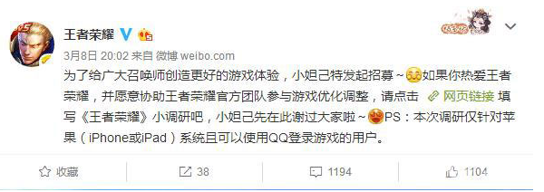 iOS体验服发号地点在王者荣耀官方微博,官微已发布相关申请调研,但只针对QQ大区的玩家,所以iOS微信大区的玩家只能退出本次抢号活动。这份调研主要是筛选出最佳体验服玩家,对于段位过低或在线不长的玩家,可能无缘于本次iOS体验服的资格开通。