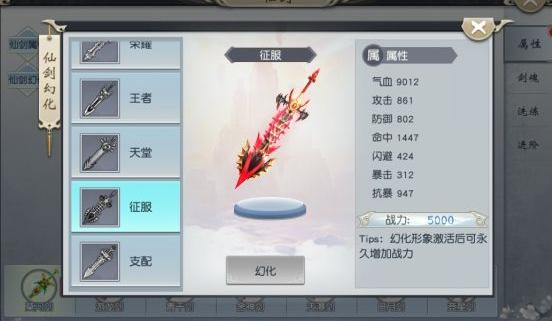 除7种仙剑外,可以通过幻化改变仙剑外观,仙剑幻化不仅仅可以改变仙剑的外观,也是可以增加仙剑的各项属性的哦