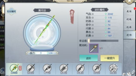 消耗【剑丸】进行仙剑升阶,升阶仙剑可以大幅度提高仙剑战力属性,剑丸可以在商城购买哦。