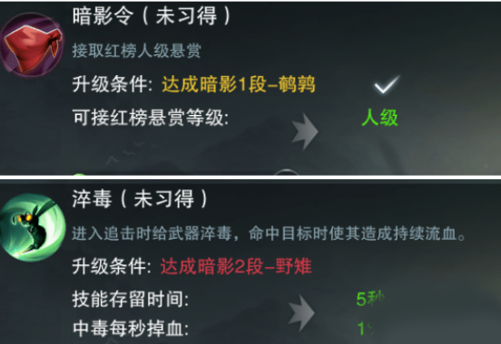 暗影行当就是杀手,行当秘技都是有助于刺杀的,随着行当等级提升,悬赏佣金扣得越低,秘技等级也能学习更高级的:
