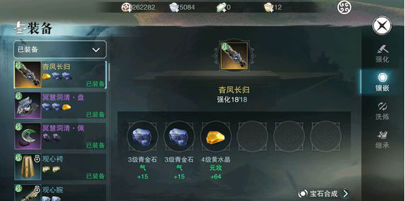点击镶嵌 可以看到宝石相关 (注:很多人说送的抗性宝石不能镶嵌,那是因为装备的等级不够 40级装备以下只有二孔 ,50级装备三孔 70级装备四孔 ,到第三孔才能镶嵌抗性相关宝石。) 这里可以看到宝石一键合成 。