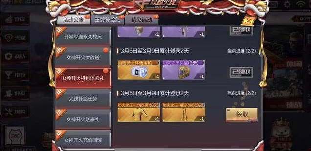 首先是,幽暗骑士体验礼包,还有功夫之王的三件套,这些好东西是需要大家昨天也登录过的才行,不然达不到累计登录两天的要求,不过依照大家对穿越火线的爱,这个基本上都能拿到了!