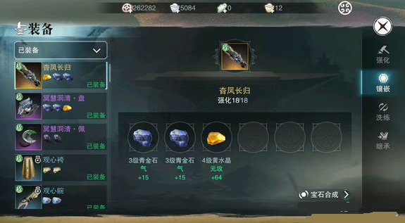 点击镶嵌 可以看到宝石相关 (注:很多人说送的抗性宝石不能镶嵌,那是因为装备的等级不够 40级装备以下只有二孔 ,50级装备三孔 70级装备四孔 ,到第三孔才能镶嵌抗性相关宝石。) 这里可以看到宝石一键合成 。