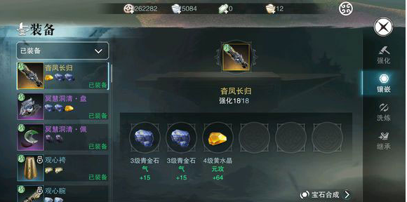 点击镶嵌 可以看到宝石相关 (注:很多人说送的抗性宝石不能镶嵌,那是因为装备的等级不够 40级装备以下只有二孔 ,50级装备三孔 70级装备四孔 ,到第三孔才能镶嵌抗性相关宝石。) 这里可以看到宝石一键合成 。