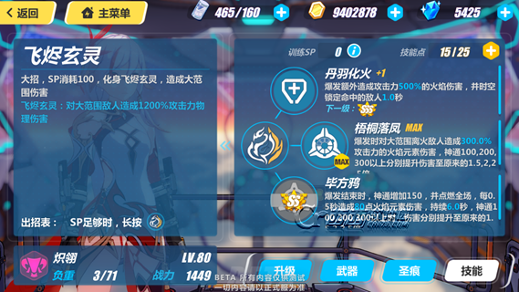 梧桐落凤:爆发时对大范围离火敌人造成276%攻击力的火焰元素伤害,神通100,200,300以上分别提升至原来的1.5、2、2.5倍
