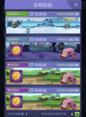 每天提供8个宠物探险任务,但是界面中最多同时显示4条探险任务,玩家完成一个探险任务后就立刻刷新一个随机品质的探险任务,玩家也可以花费钻石类获得额外的探险任务。
