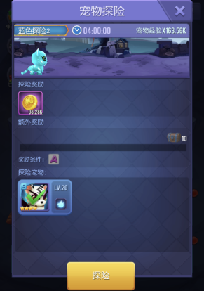 玩家在宠物探险界面可以指定自己的宠物去执行宠物探险任务,宠物探险任务没有战斗过程,派出宠物后等待探险任务时间结束即可完成,任务宠物探险任务有固定奖励和额外奖励,根据任务条件达成数量的多寡决定额外奖励的好坏。