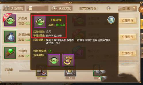 王城运镖是日常任务,全天开放,人物等级满38级就可参加运镖,每天可以拉3次镖车。