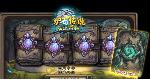 现在预购50点奥术之尘即可获赠50包“女巫森林”卡牌包,此外还将获得黑暗森林卡背(可立即使用)以及额外奖励的20包“女巫森林”卡牌包!在新扩展包上线后,你就能体验连开70包的爽快了!