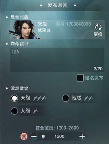 各位大侠可以悬赏自己的仇人,人级起步价360银子,地级翻倍,天级1300起步。目标被杀死后飞鹰会发来墓碑位置让你过去祭奠。