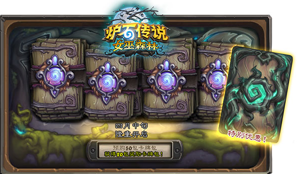 现在预购50点奥术之尘即可获赠50包“女巫森林”卡牌包,此外还将获得黑暗森林卡背(可立即使用)以及额外奖励的20包“女巫森林”卡牌包!在新扩展包上线后,你就能体验连开70包的爽快了!