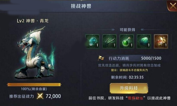 点击搜索就可以看到神兽了,神兽血量是100%,我们有挑战战力,战力低的就不推荐打高级的,每次打神兽还可以获得奖励和神兽鳞片,而且这里是不会掉战力的。打神兽可以获得不少的碎片,这个碎片对我们来说是很重要的,这个是打造高级君主宝物的必备品。