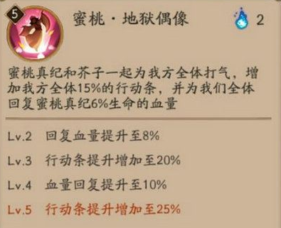 蜜桃和芥子为全体打气。增加我方全体15%的行动条,并为我们全体恢复蜜桃真纪的6%生命的血量。