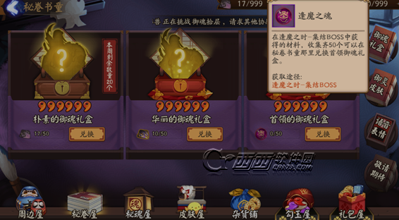 已通关御魂10层的阴阳师大人击败逢魔之时中的集结首领后可获得逢魔之魂,收集齐50个逢魔之魂可在秘卷书童中进行首领御魂兑换。