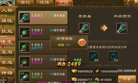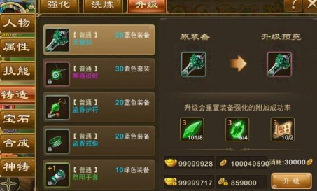 装备不能进行替换,那么怎样才能获得更高级的装备呢?这只能通过铸造里面的升级功能升级来获得更高级的装备。玩家到达20级的时候,就会激活装备的升级系统。升级所需要的材料方面,攻击类的装备需要陨石、精钢和升级卷轴,而防具类的需要玄铁、精钢和升级卷轴,这些材料的产出途径多样,就包括:宝库寻宝、装备副本、远古禁地、长生界、魔神入侵等等。有3点比较重要的,小策在这先偷偷告诉你们:1在同等级阶段内的装备升级,是不需要升级卷轴的,只有跨等级段的升级时,才需要用到升级卷轴;2升级会重置强化的附加成功率,还会提升洗炼的属性洗炼上限;3多余的升级材料还可以合成下一等级的升级材料。
