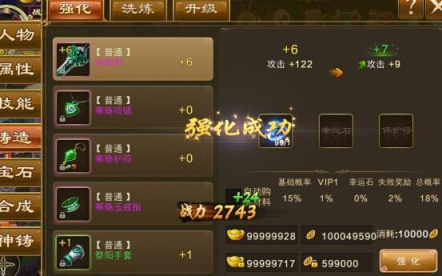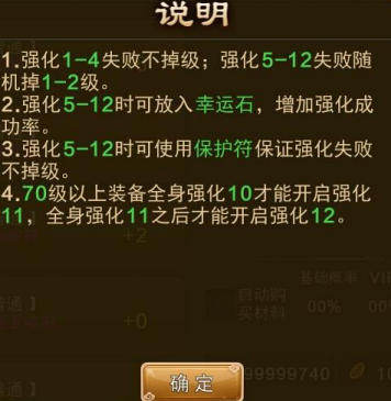 玩家到18级的时候,就会激活装备系统的强化功能,强化装备主要用到强化石,强化石又分为初级、中级、高级跟顶级,其中强化+1到+3使用初级强化石,强化+4到+6使用中级强化石,强化+7到+9使用高级强化石,强化+7到+9就需要用到顶级强化石。低级强化石产自装备副本、商场购买、宝库寻宝以及远古禁地等,前期可以收集多点低级强化石,各位可以通过合成功能得到更高级的强化石。小策可提醒大家,强化+1到+3的成功率很高的哦,+3升+4的时候成功率会降低到50%,强化的等级越高,成功率就越低,而且还会有掉级的可能性,不过倒也不怕,除了喜欢赌人品的玩法外,还有使用保护符确保不掉级,使用幸运石增加成功率。为了让大家更清楚,小策附上一张说明图。