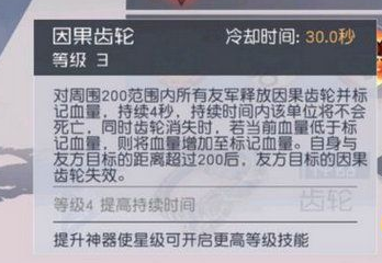 因果齿轮:对周围200范围内所有友军释放因果齿轮并标记血量,持续4秒。持续时间内改单位将不会失望,同时齿轮消失时,若当前血量低于标记血量,则将血量增至标记血量。自身与友方目标的距离超过200后,友方目标的因果齿轮失效。