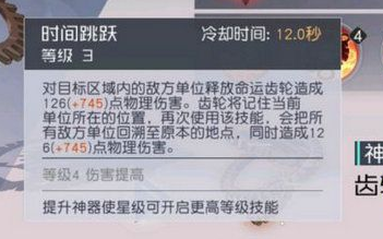 时间跳跃:对目标区域内的敌方单位释放命运齿轮造成126点物理伤害。齿轮将记住当前单位所在的位置,再次使用该技能,会把所有地方范围回溯至原本的地点,同时造成126点物理伤害