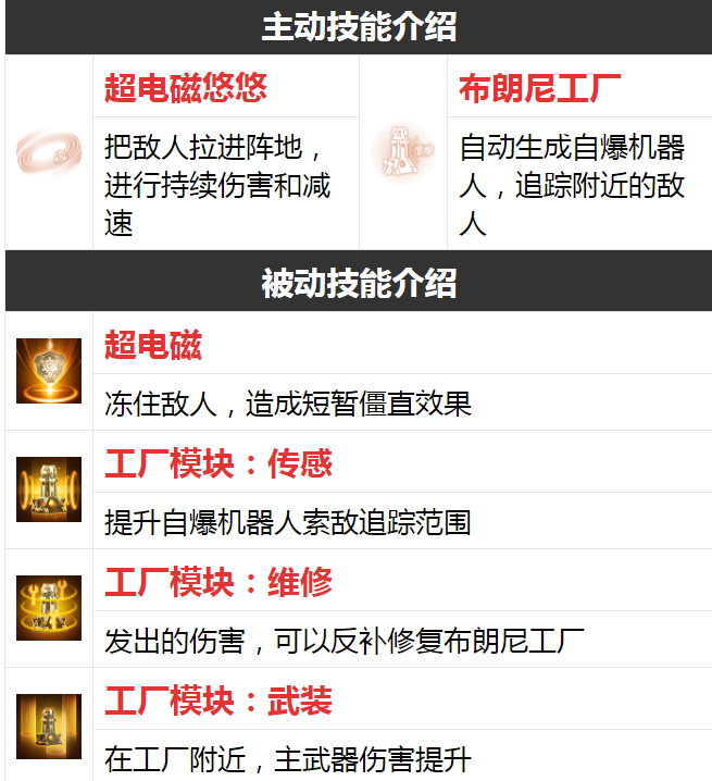 电磁炮必须要去解锁第一个被动技能,技能可以在吸进别人的时候冻住别人。这个英雄是不错的控制英雄,而且属性也不错,就是输出比较低,必须依赖机器人打输出,自身的输出不高。对周围的队友有武器伤害加成,所以这个英雄比较适合打3V3的据点争夺战。