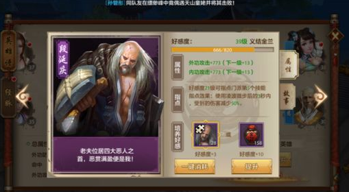 段延庆作为紫色英雄,他能够为大侠带来更为优秀的属性值提升。段延庆能够提升各门派大侠的内(外)功攻击力,而且伴随着英雄好感度的提升,攻击属性的提升也更为明显。每升级一级好感度能提升大侠的内外功攻击力10-20点。比如,当段延庆的好感度为义结金兰39级时,能为大侠们带来内(外)功攻击力+773。