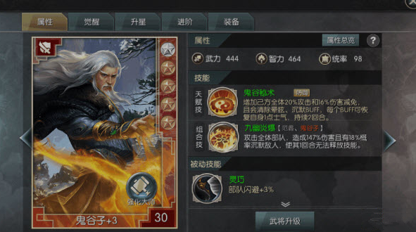 第一个前排,鬼谷子!他是游戏里红将中算比较好获得的一个了,而作为红将之一,各种属性在所有武将中也是出类拔萃的!鬼谷子一般放在前排,这和他的兵种与技能有关,首先他带的兵属于步兵,适合放在前排,而鬼谷子的技能,大多数都是防御性的技能,虽然伤害也有不少,但更多的是起到一个防御的作用,前排最适合他不过