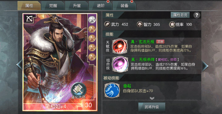 田忌赛马的故事想必大家都是听过的,但我想说的是选择田忌并不是因为这个原因,最主要的原因还是他能够和蔺相如组成组合技,真,无极杀阵!紫将不比橙将,培养相对来说比较简单,而且这两个都是前期培养并且使用的,可以硕等级和带兵量都不会差,并且还有一定的战斗力,放在第二部队再合适不过~