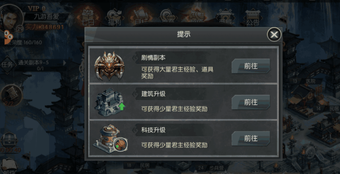 在升级方面点击问好,其实可以发现游戏获取君主经验的方式:剧情副本、建筑升级、科技升级。其实建筑升级和科技升级其实是一个概念。