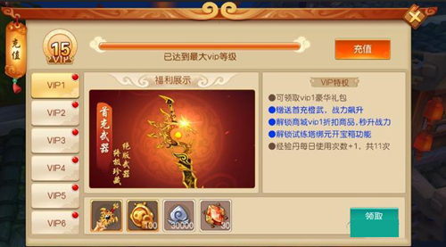 《大圣归来棒指灵霄》中VIP分为15个等级。玩家通过充值元宝提升VIP等级,VIP等级越高,充值的元宝越多,同时获得的福利越多,特权越强大。
