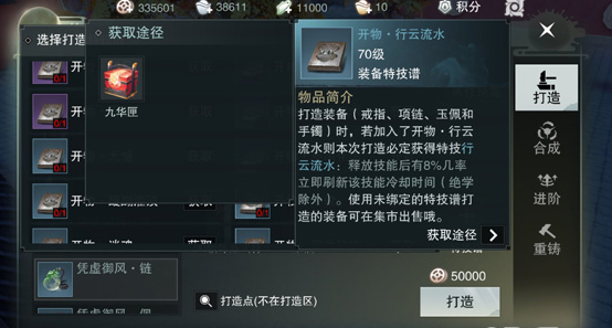 打造属性:释放技能后有8%几率立刻刷新该技能冷却时间(绝学除外)