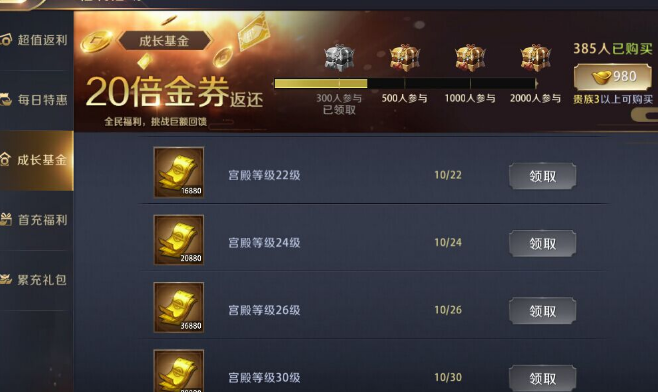 4、宫殿升级,当我们的宫殿等级达到10、15、20、25、30,都会送一定数量的金券礼盒,打开就会获得1000的金券,所以快速升级宫殿等级也是可以获得金券的。