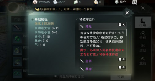 特技打造选择:武器组特技——金色特技先发制人、紫色特技无妄无我、蓝色特技破甲外