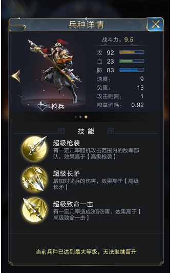 十一级枪兵:攻击92点、血量23点、防御83点,速度9、负重13、攻击距离1、粮草消耗0.92。