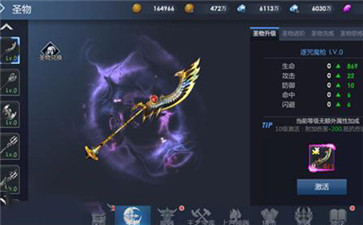 激活该圣物才可以提升该圣物的阶数。提升该圣物阶数时消耗该圣物碎片。下一圣物激活条件,前一圣物阶数达到2阶。圣物没提升1、5、10、15、20阶时各增加一条洗练属性,洗练属性最高5条。