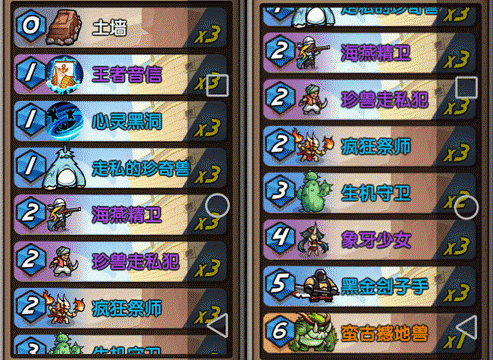 ①土墙:0费的墙,前期可配合海燕精卫建立场面优势、可保护象牙少女;在撼地兽登场后也能够无消耗打出进行护脸。