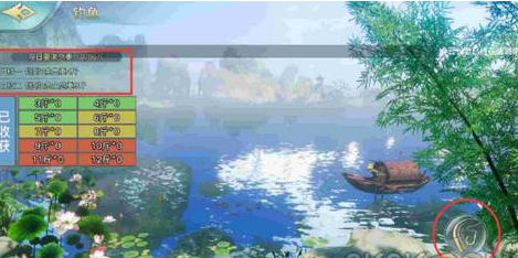 这里就是钓鱼活动的垂钓界面了,左上角红框处是我们接任务时的目标要求,左下角分别显示昨日垂钓记录、昨日记录保持者和当前已用时间。当然咯玩法垂钓没有时间限制,达到今日要求总重则活动结束,所以想要拿到全部奖励的小伙伴,一定要优先完成目标一和目标二哦。现在我们点击右下角的钓竿进行垂钓。