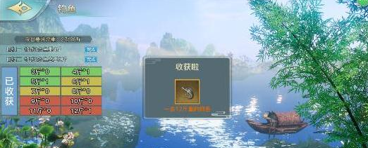 几秒后鱼咬钩会出现如图所示进度条,进度条中绿黄红三种颜色分别与已收获中颜色鱼类相对应(如:收钩在黄色区域会有几率收获6斤,7斤,8斤的一种),从这里我们可以看出鱼类是按重量分10种类型。此时我们再次按交互键收钩。收获啦!12斤重的鲈鱼,再接再厉继续垂钓。完成今日目标后会自动退出垂钓界面,快去钓鱼翁那里领取丰厚的劳动奖励吧!