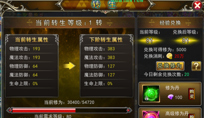 转生等级提升需要消耗转生修为,可以通过活动、礼包、商城等得到的修为丹来获取修为,也可通过消耗经验和金币兑换大量修为。
