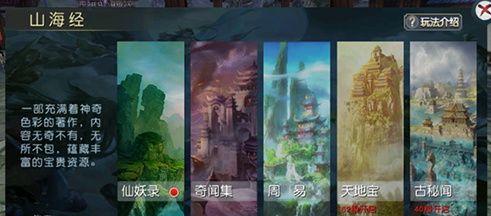 进入山海经后,玩家可以看到所有的玩法界面:仙妖录、奇闻录、周易、天地宝、古秘闻