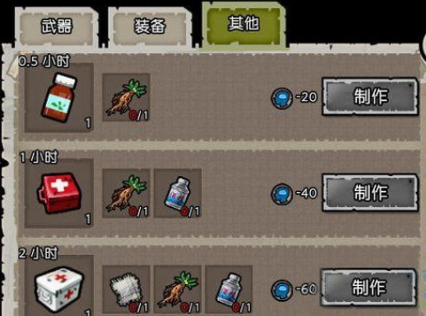幸存者危城中药品材料分为三大件:草药、酒精和纱布。在建筑物中或者NPC那里看到这几样药品材料,不要犹豫,果断入手,过了这村就没这店了。拿到药品材料之后就可以去工作台制作各类药品了。一级工作台可以制作止血药,二级工作台可以制作医疗包,三级工作台可以制作急救箱。这三种药品都是行走江湖不可或缺的必备良药。