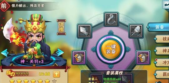 穿戴装备:每位武将都可以通过穿戴装备提高战斗力,穿戴2件及以上装备会激活套装效果,可额外提供属性加成。