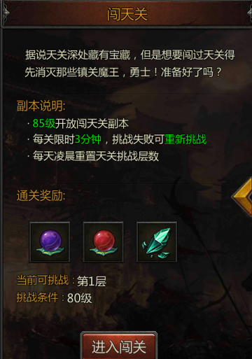 玩家等级到达85级的玩家可以在盟重NPC天关统领处进入副本。