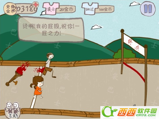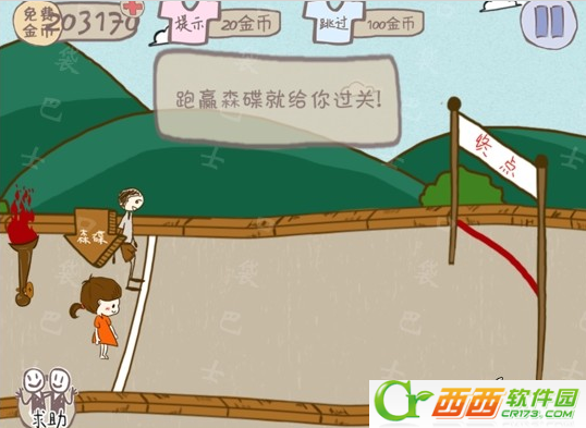 本关可以看到,通关目标提示,就是需要跑赢旁边的叫森碟的女孩(怎么感觉跑赢这样一个小mm也没什么压力嘛!),常规点击人物开始跑,是跑不赢的。毕竟是“风一样的女子”所以需要找到通关的关键。