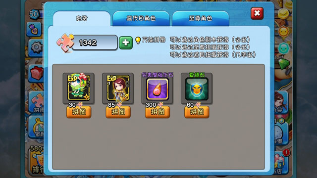 2.拼图板块中可以用万能拼图换土豪榕【推荐,比较划算】,大约可以换来7W多的经验,应付一般等级升级绰绰有余。但相信小编,平时最好还是用冒险板块中刷下的卡牌来融合,虽然比较慢一点,但这些卡牌毕竟是免费无限量供应。拼图在游戏中是很珍贵的资源,获得途径有限,而且数量不多,所以平时可以多攒一点以防不时之需。