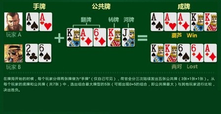 在牌局开始的时候,每个玩家分得两张牌作为“手牌”(仅自己可见),荷官会分三次陆续发出五张公共牌(3张+1张+1张)。从每个玩家的底牌和公共牌(共7张)中,选出组合最大牌型的5张(可能出现0+5的组合,即公共牌最大)与其他玩家进行比较,决出胜负。
