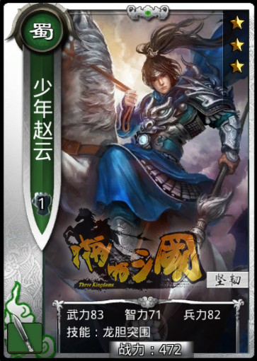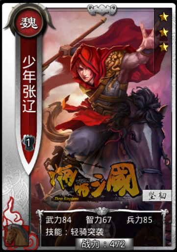 这里我建议新手玩家选择骑兵中的少年张辽或者枪兵中的少年赵云。张辽群体加攻加速技能对于高攻击高机动的骑兵部队来说是最好的选择。少年赵云加速加攻回血技能,枪兵最大优点和最需要加强的都在少年赵云身上体现了。这两个少年起始英雄,即使用到游戏中后期,在没有同类金卡武将之前都有很大的用武之地。