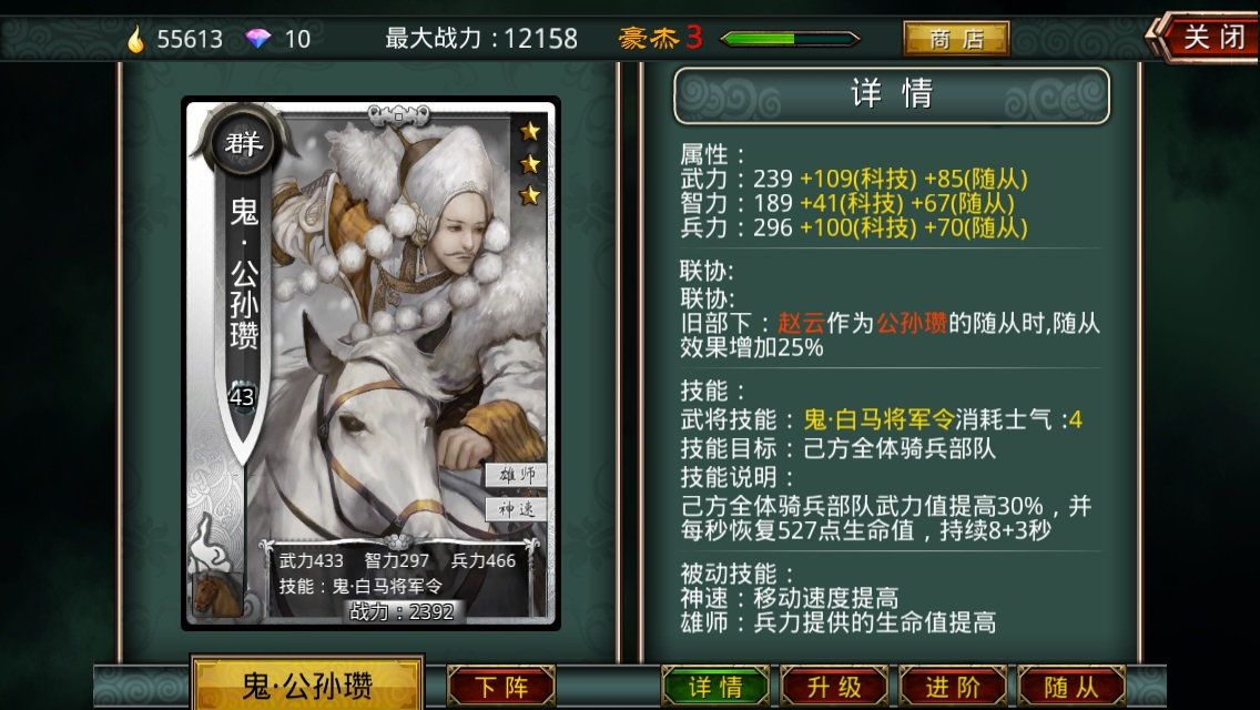 在武将选择上,公孙瓒这张银卡是必须的,群体加攻加血,关键是加血,弥补了骑兵血量低,缺回复的缺点,大大提高了骑兵部队的生存能力。有了少年张辽和公孙瓒,号令流五骑就算基本成型了,接下来可选择的武将就很多了,金卡中推荐马超,这张金卡非常容易得到,而且3被动,武力高,无暇技能无视负面BUFF影响,是新手玩家最好的金卡选择。