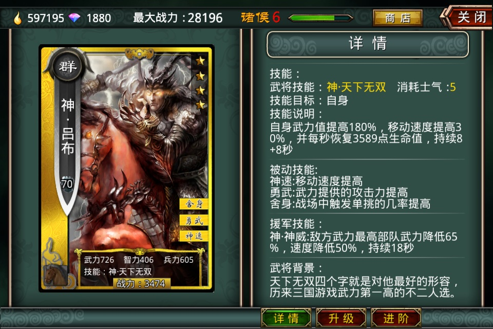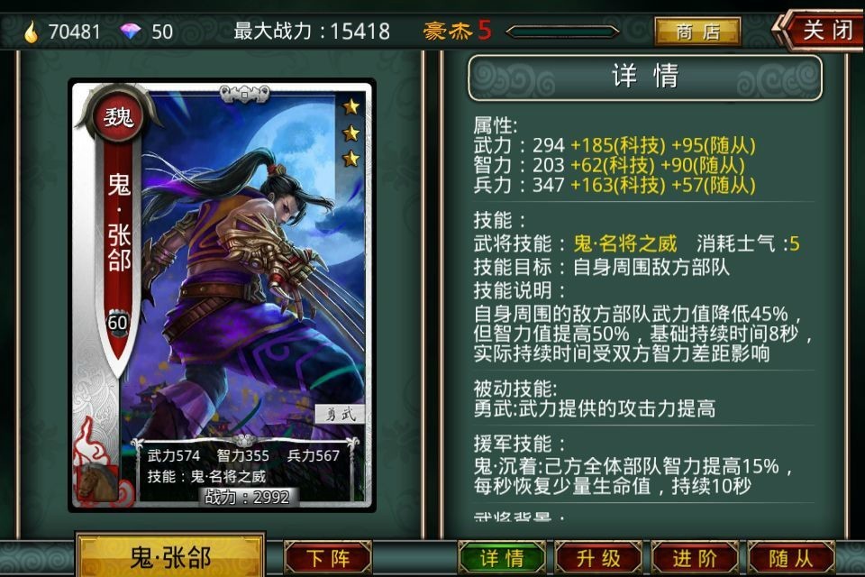 以吕布作为核心,凌统和吕布技能相互配合很哈皮的,郭嘉的技能弱化就不用多说了,弱智还是很给力的。司马懿也不用说了就是毒针,张辽技能需要4个士气,给所有骑兵增加速度和武力,给吕布为辅助也不错,这是我的小队伍。