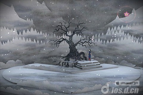 1、拿到花后,回到灰色的开篇,走上台阶,把花从右上角放在闪光的树上。出现闪光点,走进去,翻页。