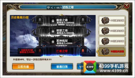 每天重复挑战低层的关卡未免疲惫,此时选择扫荡,就可以立刻通关10层(未通送的关卡不能扫荡)。随着VIP等级的增加,可扫荡的次数也会增加!
