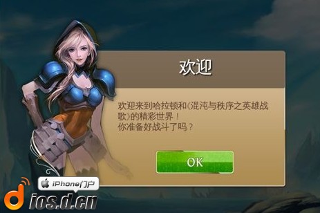 第一次进入游戏后,系统会有相应的介绍和讲解。一位美丽的女英雄向各位玩家打招呼:“欢迎来到哈拉顿和《混沌与秩序之英雄战歌》的精彩世界!你准备好战斗了吗?”